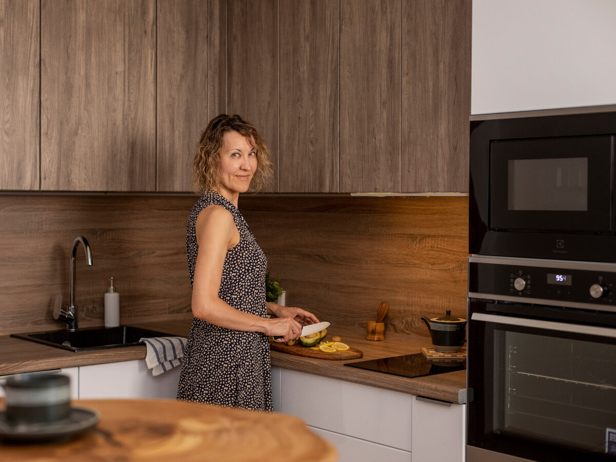 А далее было долгое обсуждение эскиза гарнитура: я хотела, чтобы он был в минималистичном стиле, но не знала, как его реализовать. Богдан подсказал установить систему tip-on на дверцы, чтобы избавиться от лишних ручек, которую тут же и продемонстрировал.